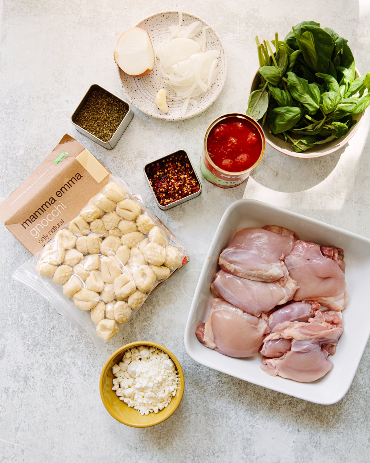 - Boneless chicken: One of the huge pleasures of baking gnocchi with chicken is how the pan juices from the chicken and tomatoes meld together to make a sauce. That’s why I urge you to use boneless chicken thighs, not breasts, for this recipe. They simply have more fat and flavor than chicken breasts.