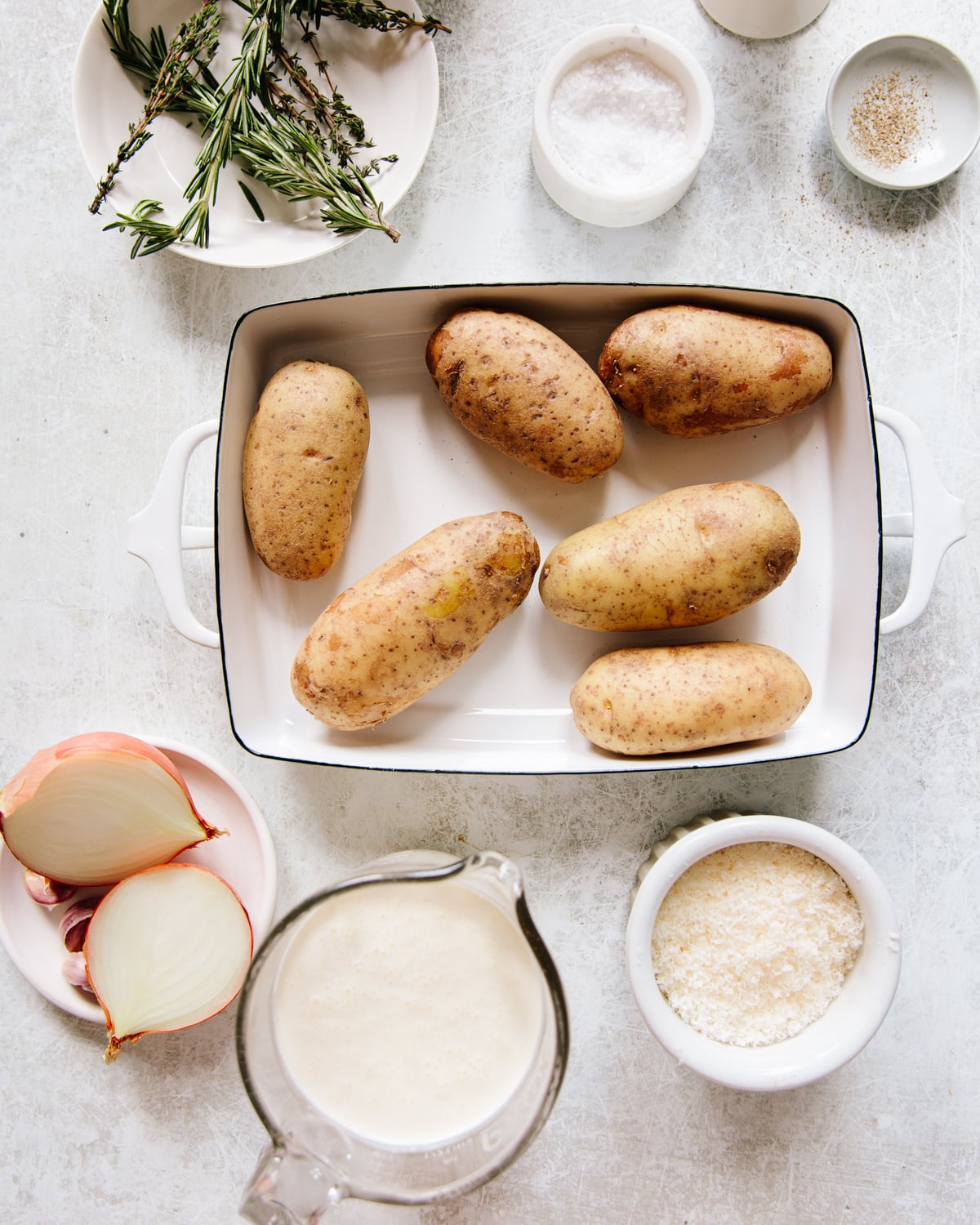 - Herbs: I use two types of woody fresh herbs to season the cream and the potatoes — a few sprigs of thyme that steep and release flavor into the cream, and chopped fresh rosemary leaves that bake with the creamy sauce and potatoes.