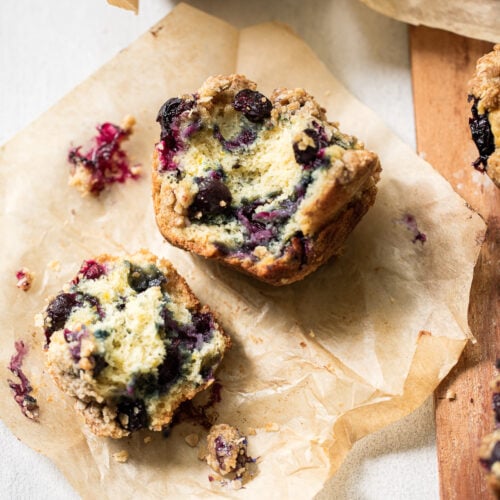 Spoon the batter into the muffin cups ¾ full. Top with the remaining blueberries and the crumble topping.